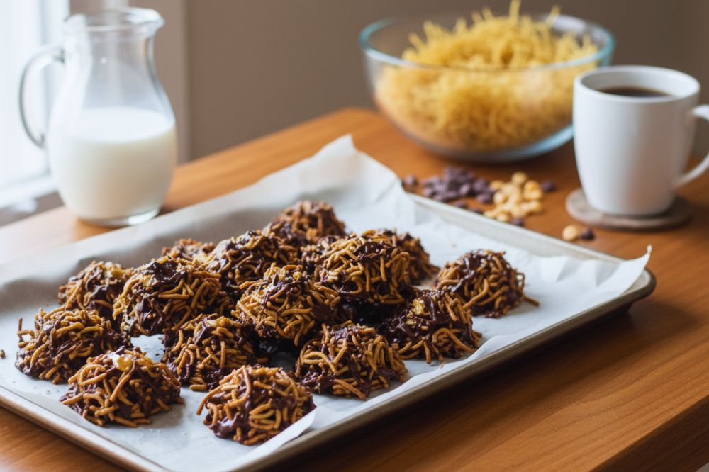 Line a baking sheet with parchment paper or wax paper so the cookies don’t stick. Set aside. In a large microwave-safe bowl, combine the butterscotch chips, chocolate chips, and peanut butter. Microwave in 30-second intervals, stirring after each, until the mixture is completely smooth and melted. Gently fold in the chow mein noodles until they are evenly coated with the chocolate-butterscotch mixture. If you use coconut or nuts, stir them in at this stage. Drop spoonfuls of the mixture onto the prepared baking sheet, shaping them into little “haystacks.” Work quickly before the mixture begins to harden. Allow the cookies to cool at room temperature until firm or place them in the refrigerator for about 20–30 minutes to speed up the process. Once set, remove the cookies from the paper and store them in an airtight container. Enjoy as a quick dessert, snack, or party treat!